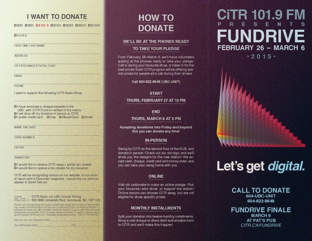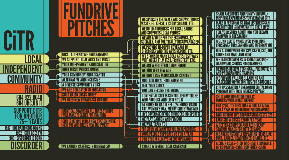 I did a lot of the advertising, events, and swag design at CiTR for a couple of years. Fundrive always included a lot of pamphlets, buttons and other informational materials with a new theme for every year: