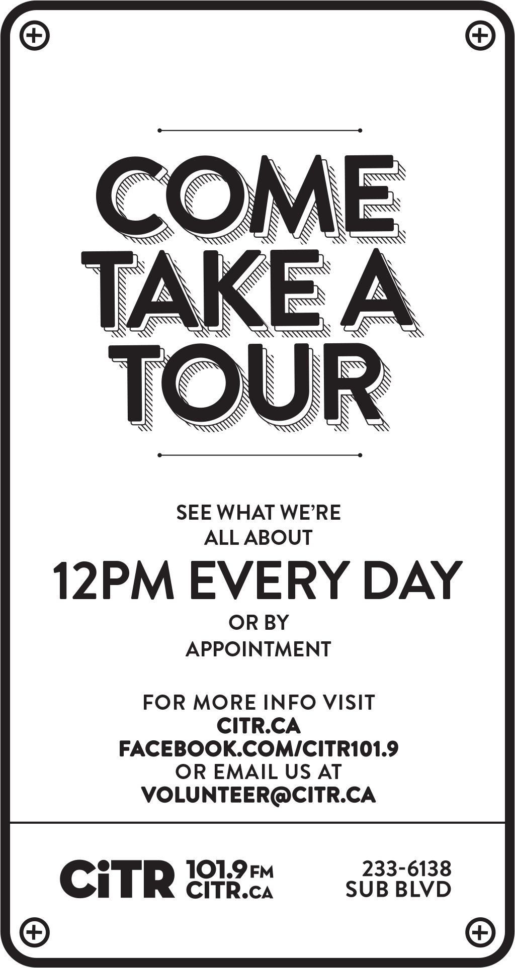 After the Ubyssey, I worked as a designer for the campus radio station, CiTR. I had to come up with a brand identity and make a lot of station materials, so I created a rounded circuit-like system that could be used for infographics or basic signage.
